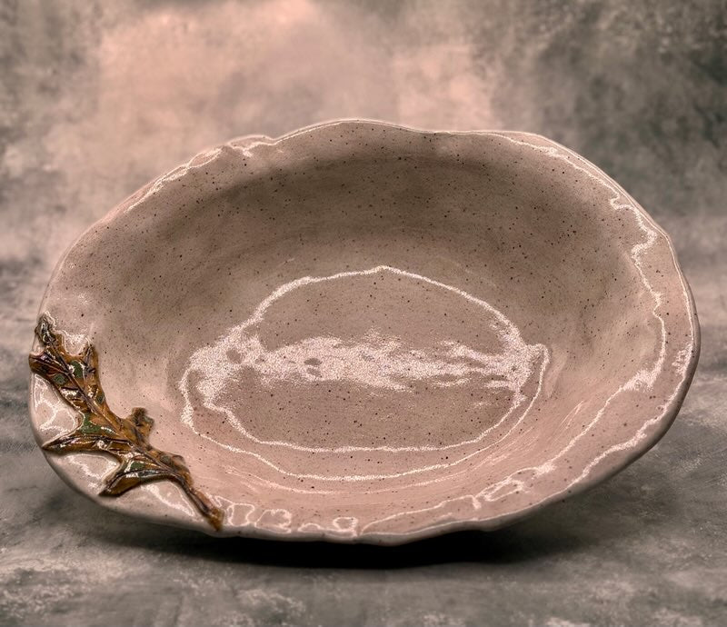 Please note: The bread bowl pictured is an example. As each piece is individually created and hand-built, your bowl will have its own unique characteristics. You will see subtle variations in the wavy rim, the speckling of the white glaze, and the detailed color of the oak leaf accent. This guarantees that the bowl you receive is a one-of-a-kind treasure.